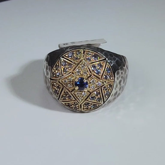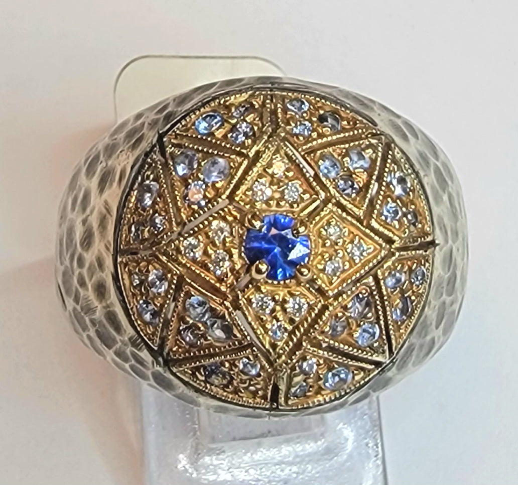 The ring is hand crafted in oxidized sterling silver and 14k yellow gold featuring .68 tcw Montana sapphires and .06 tcw diamonds. This Bombay style ring has an oxidized and hammered finish and a fun everyday ring.