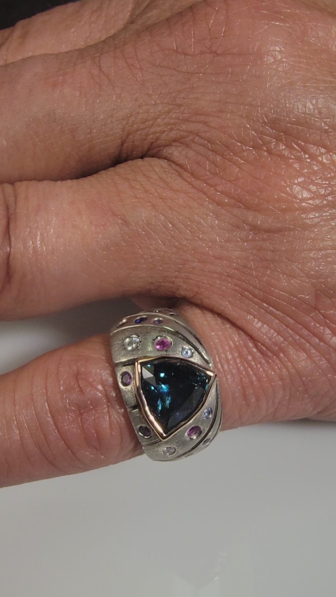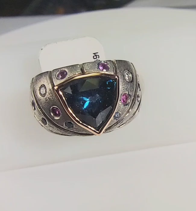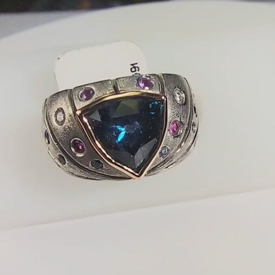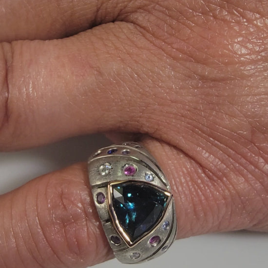 This one of a kind ring was hand made in 18k rose gold and palladium featuring a bezel set 2.61 trillion cut, deep, slightly greenish blue Montana sapphire. The ring is crafted with an open work design down the sides of the shank featuring .09 tcw of diamonds and .54 tcw of Montana sapphires that are flush set between the open work.