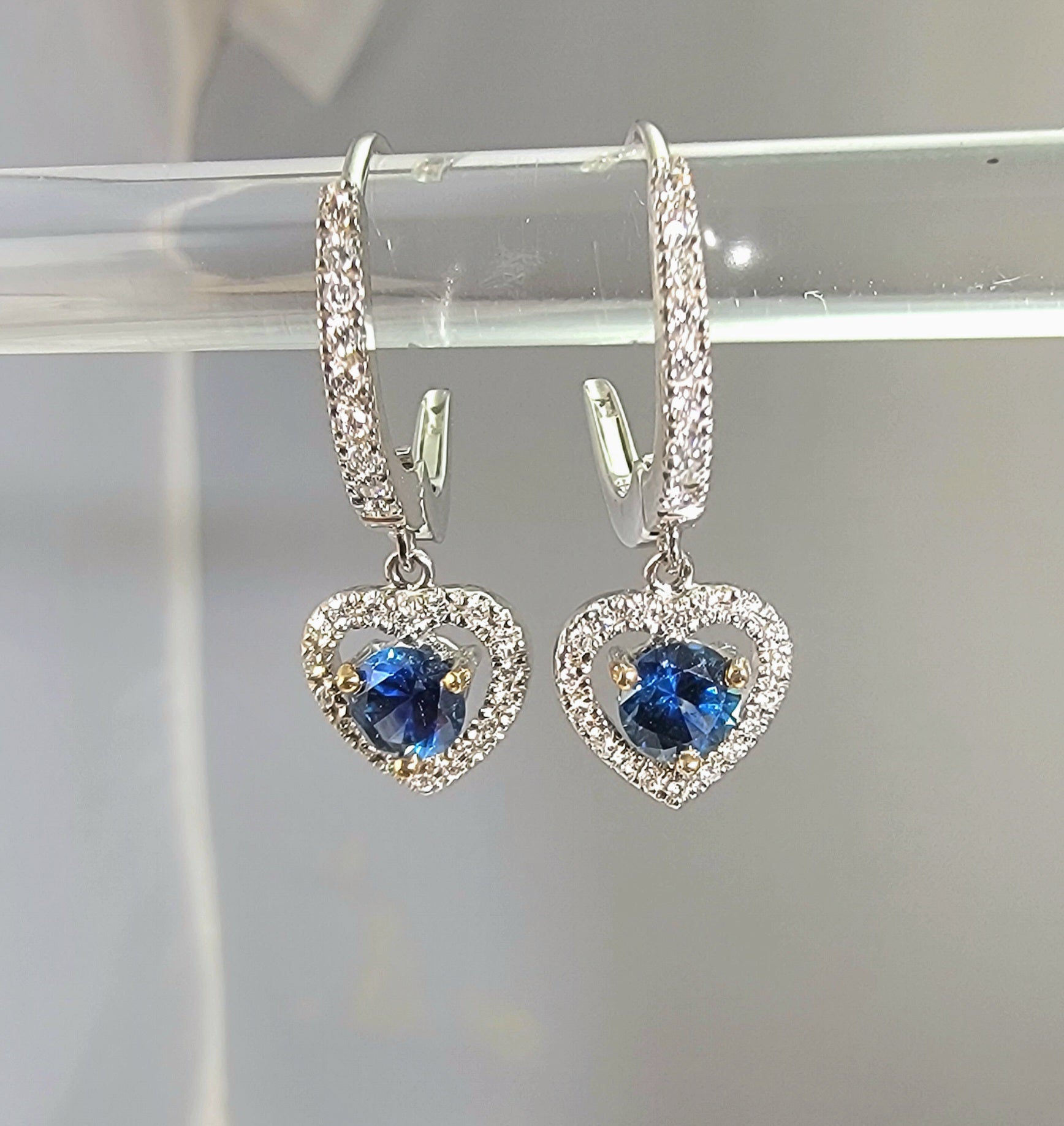 These lovely 18k white gold dangle earrings feature .76 tcw blue round Montana sapphires set in a pave diamond heart silhouette in a 3 prong mounting. The hearts dangle from an 18 k white gold and diamond hinge hoop. The total diamond wt. is .28 tcw