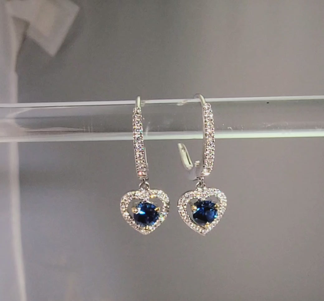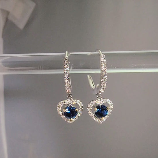 18k white gold diamond and Montana sapphire dangle heart earrings